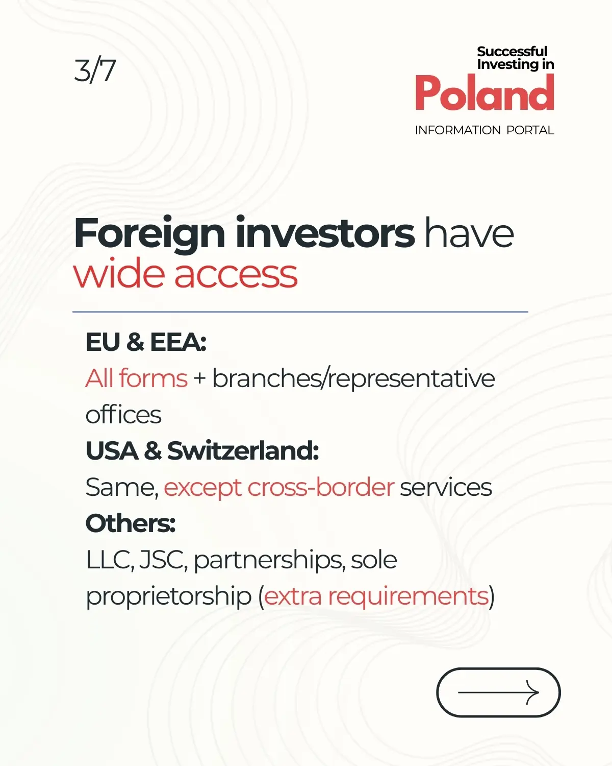 Foreigners can establish and operate businesses in Poland, but the process and options depend on their citizenship: